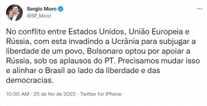 “No conflito entre Estados Unidos, União Europeia e Rússia, com esta invadindo a Ucrânia para subjugar a liberdade de um povo, Bolsonaro optou por apoiar a Rússia, sob os aplausos do PT. Precisamos mudar isso e alinhar o Brasil ao lado da liberdade e das democracias”, escreveu o ex-ministro, com destaque nosso.